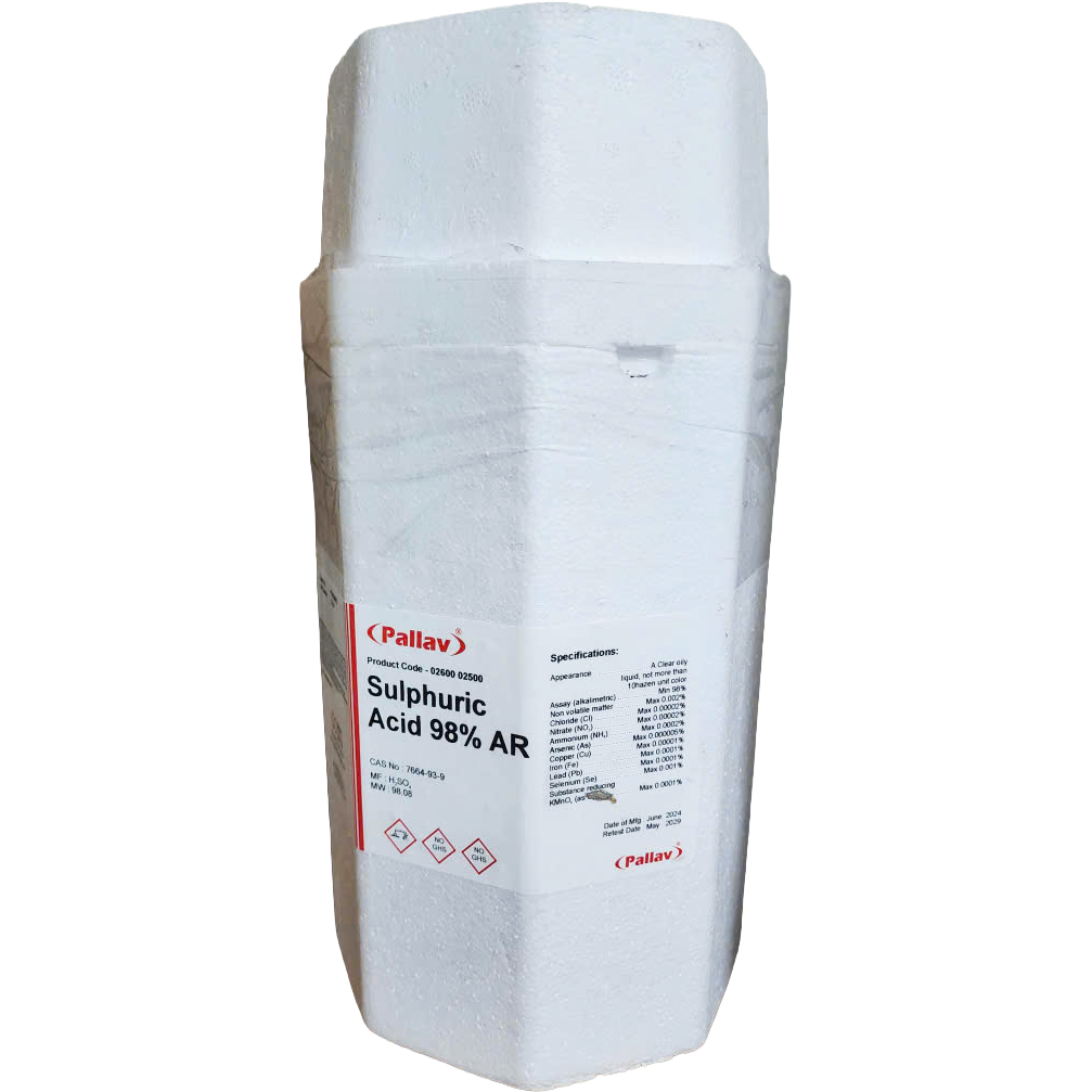 Hóa chất Sulfuric Acid 2.5 lít/chai từ thương hiệu Pallav Chemicals (Ấn Độ) là loại hóa chất tinh khiết được sử dụng phổ biến trong các phòng thí nghiệm để phân tích và chuẩn độ.